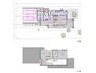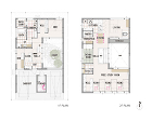 リビングよりのダイニング、キッチン見返し。奥には30cm程床レベルを上げた書斎をもつ。