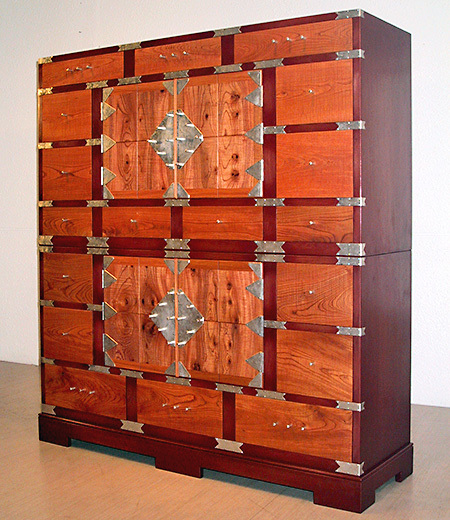 作品紹介 キャビネット 新和風 二段飾り棚 二段飾り棚 仕様はこの限りではありません。ご要望に応じてデザイン展開いたします。 参考寸法 ・ W1,375 ・ D435 ・ H1,500 素材 ・ ケヤキ( 扉・抽斗前板 ), クリ, クルミ...