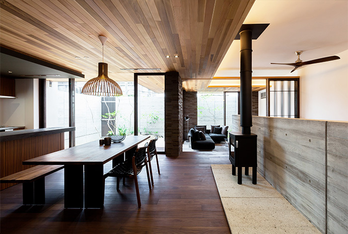 蛇籠の家は西垂れの傾斜地に建つガレージ付きのコートハウスである。 重力に逆らうように宙に跳ね出しているコンクリートのボリュームがまず目にとまるダイナミックな造形を作り上げた。人工的に切り開かれた造成地に擁壁を拵えて平坦な土地を作るのではなく...