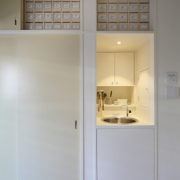 部屋の片隅には筆洗い用の流しを設けています その上部は完成作品の収納としています